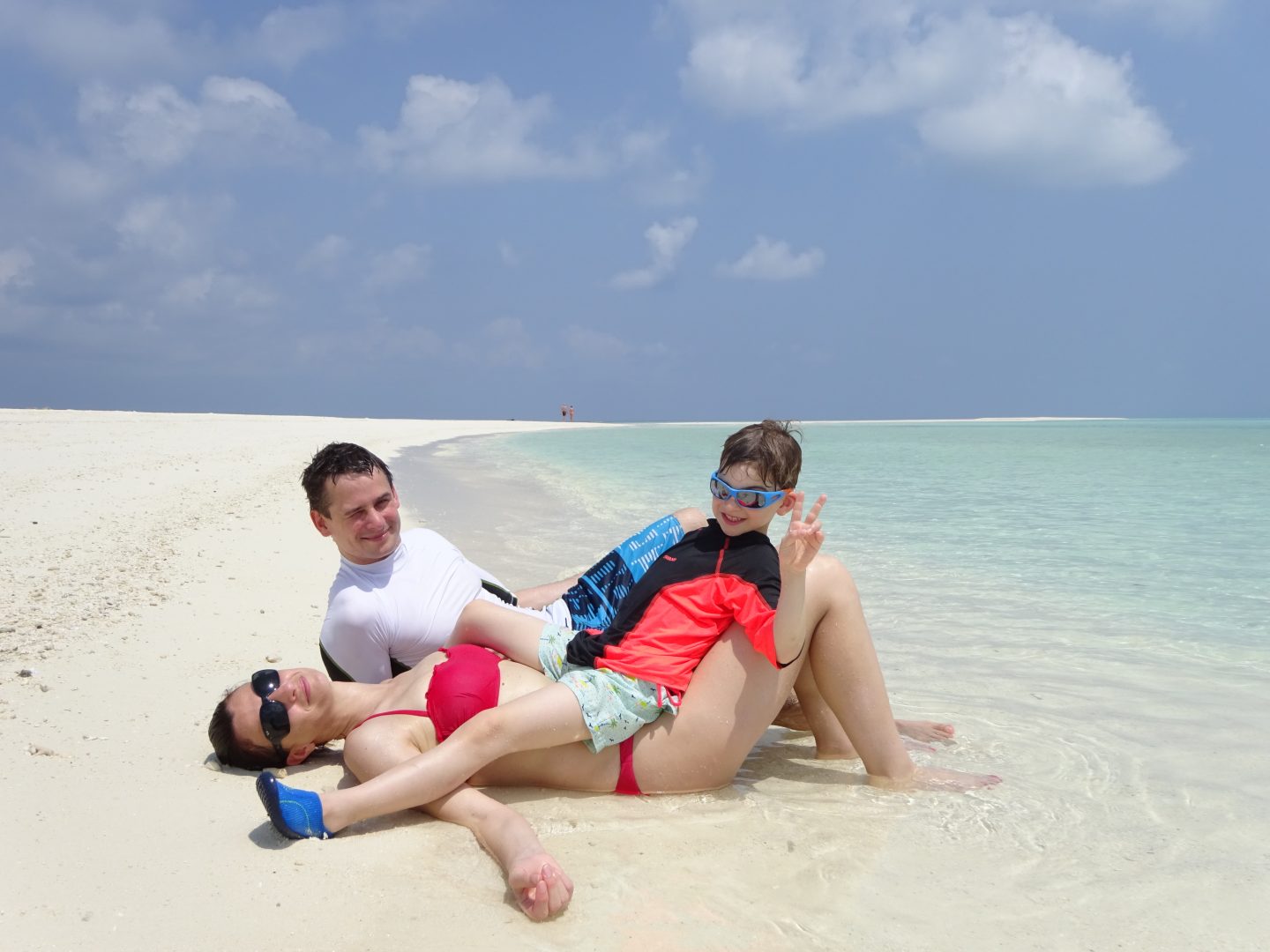 Ce matin, c’est découverte du banc de sable au nord-est de l’île, pas loin de notre maison. Ce banc avance de 500 à 800 mètres  dans l’océan (en fonction des marées), il est entouré d’une eau bleue translucide et le sable est en pente douce, c’est idéal pour les enfants. Pour les parents c’est pas mal non plus … On avance le plus loin possible, parfois on a de l’eau jusqu’aux cuisses puis on est à nouveau sur le sable, il n’y a personne, c’est magique.