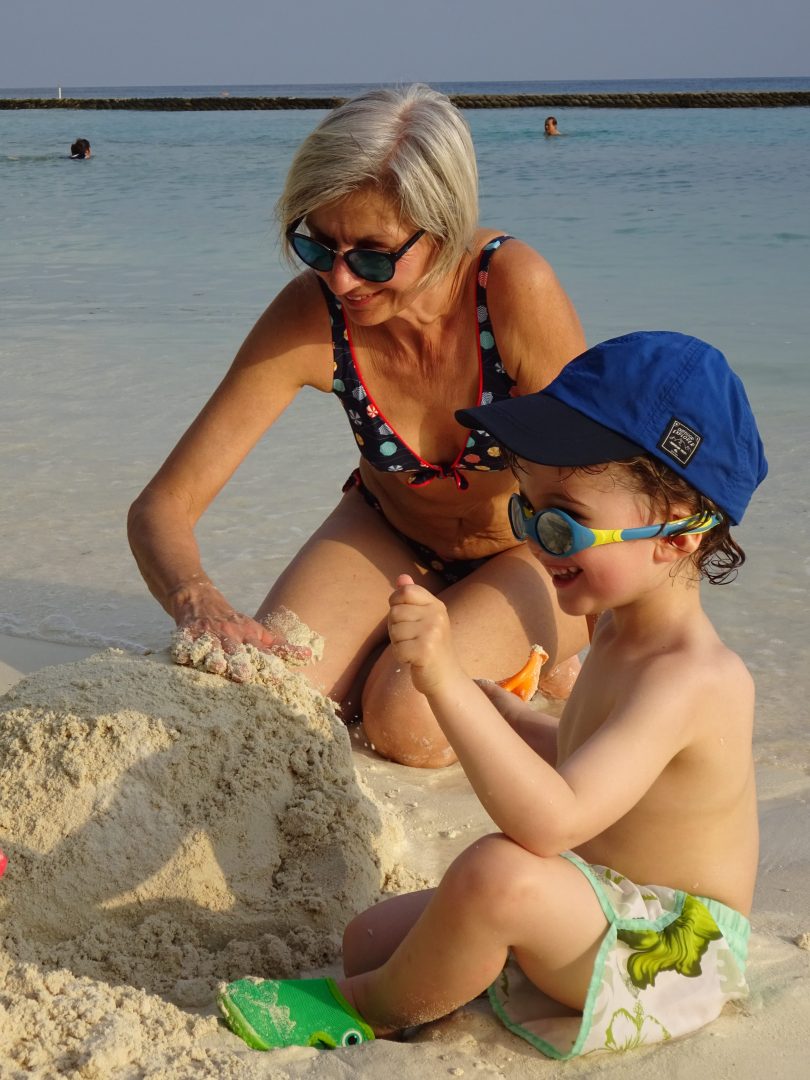 L’après-midi, c’est sieste pour récupérer du voyage puis jeux sur la plage devant la maison , Mamy fait un super château pour Robin, et Clément fait des circuits dans le sable.