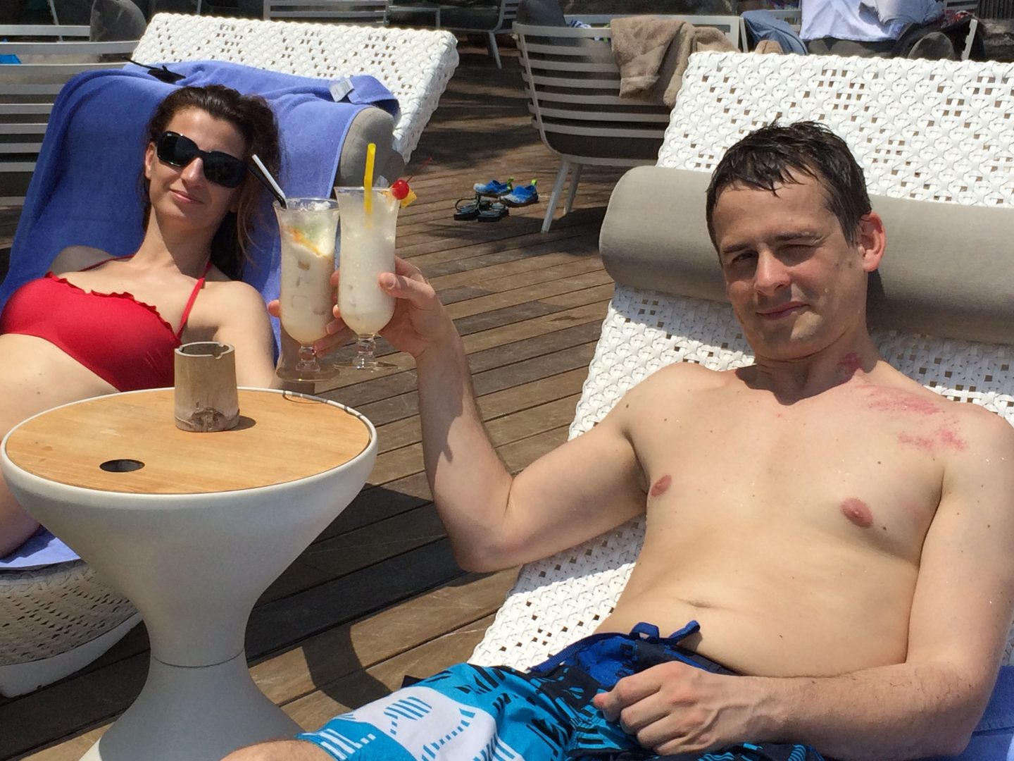 Au retour vers la maison, on passe à la piscine noire pour se rincer à l’eau douce, comme la piscine est devant le bar, Caro et Mathieu en profitent pour prendre leur première Pina Colada (elle ne sera pas la seule !).