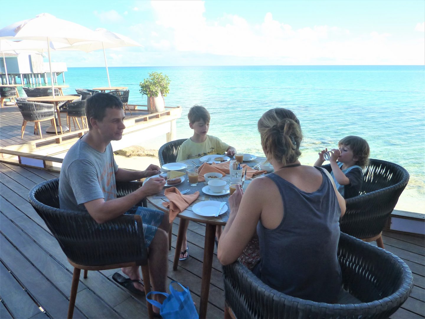 Le petit-déjeuner est extra, il y a un choix incroyable avec des viennoiseries en quantité et extrêmement variées, des plats chauds et froids (saumon fumé pour Clément !), des jus, des fruits frais, des smoothies, … et tout cela face au lagon.