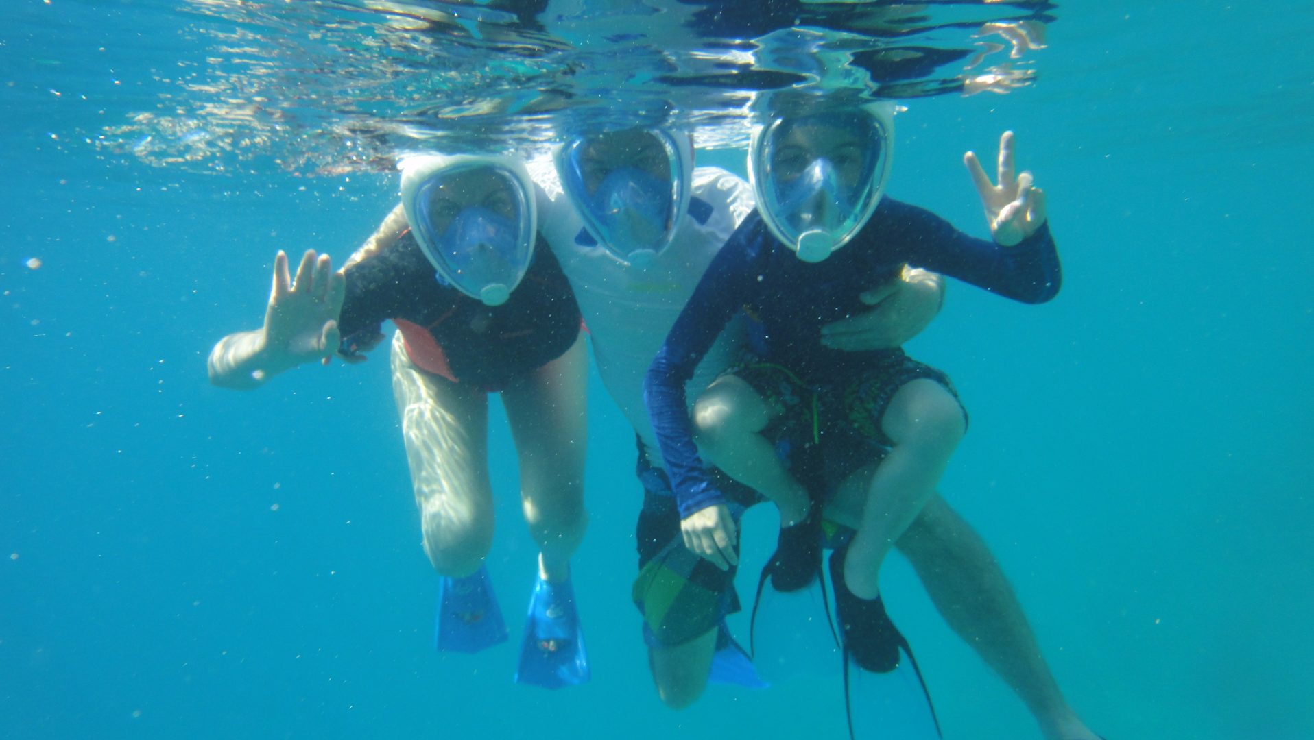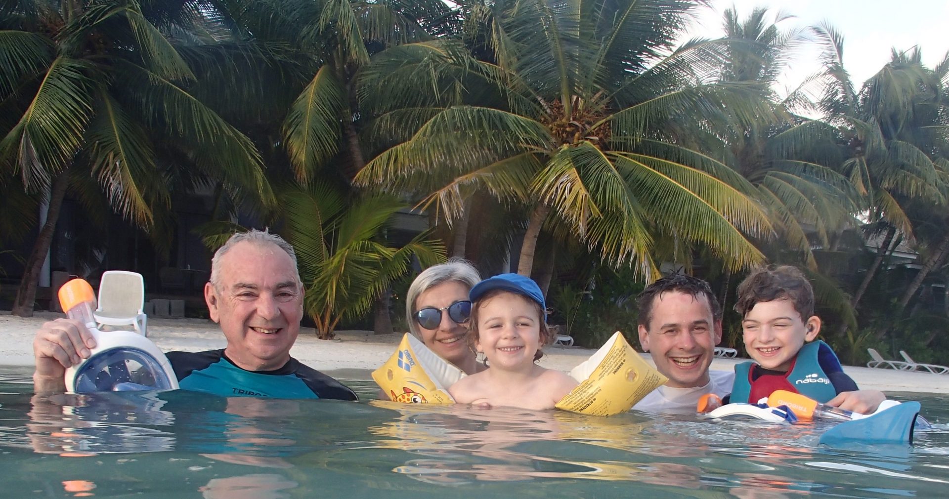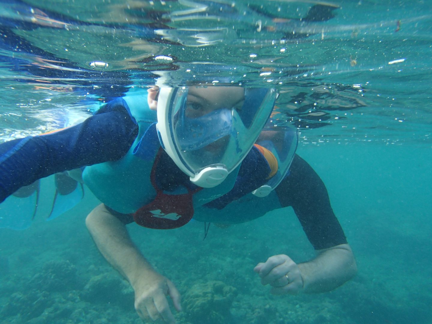 On rentre pour manger en passant se rincer à la piscine. Après le repas, c’est sieste pour Robin et snorkeling pour Clément, Caro, Mathieu et Papy.