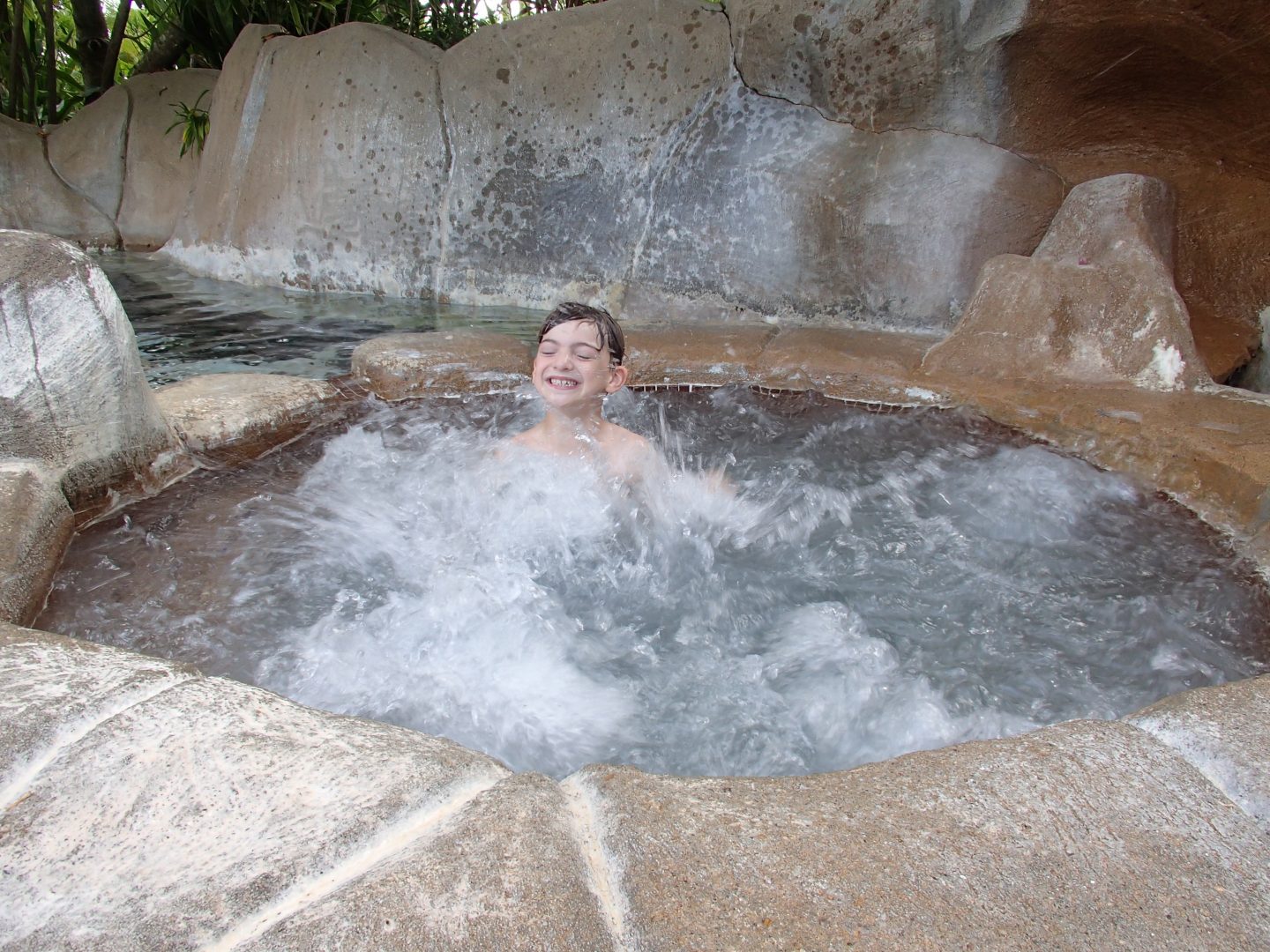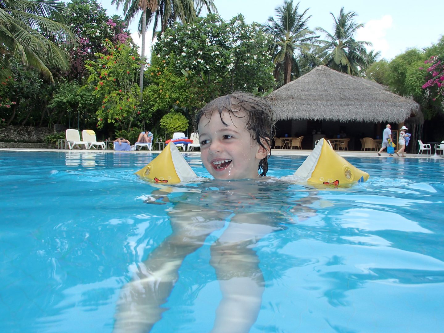 Après le petit-déjeuner, toujours aussi copieux et délicieux – face au lagon – on décide d’aller à la piscine qui a des rochers et une cascade et qui deviendra la piscine préférée de Clément.
