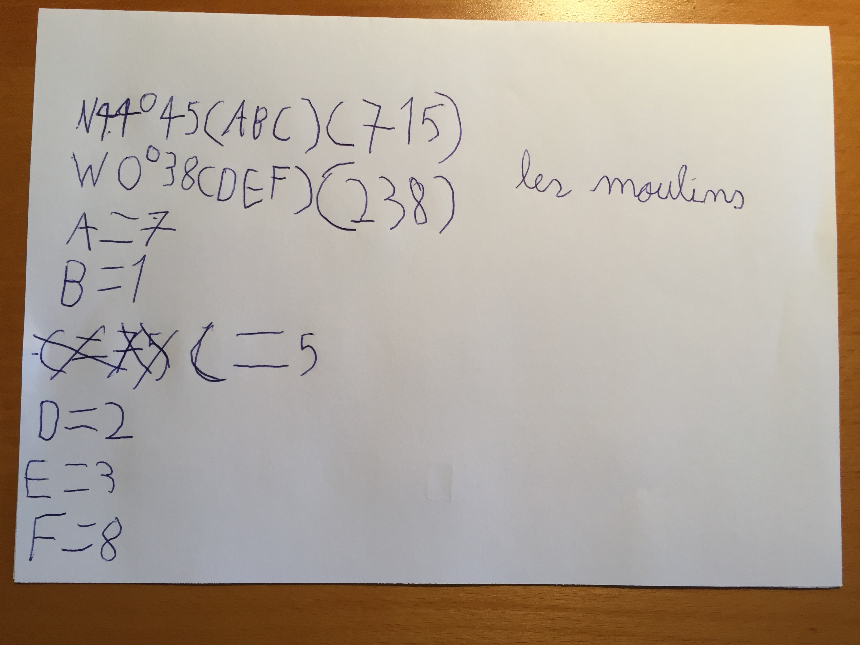 Il s’agit de trouver les coordonnées GPS de la cache mystère avec les indices ABC et DEF récupérés dans les 6 caches de la route de Moulins que nous avons trouvées en août avec Robin. Voici un exemple des indices que nous avions trouvés dans les caches.