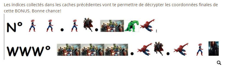 Là aussi, il faut trouver des coordonnées GPS mais grâce aux super-héros qui représentent chacun un chiffre. Un de nos indices :