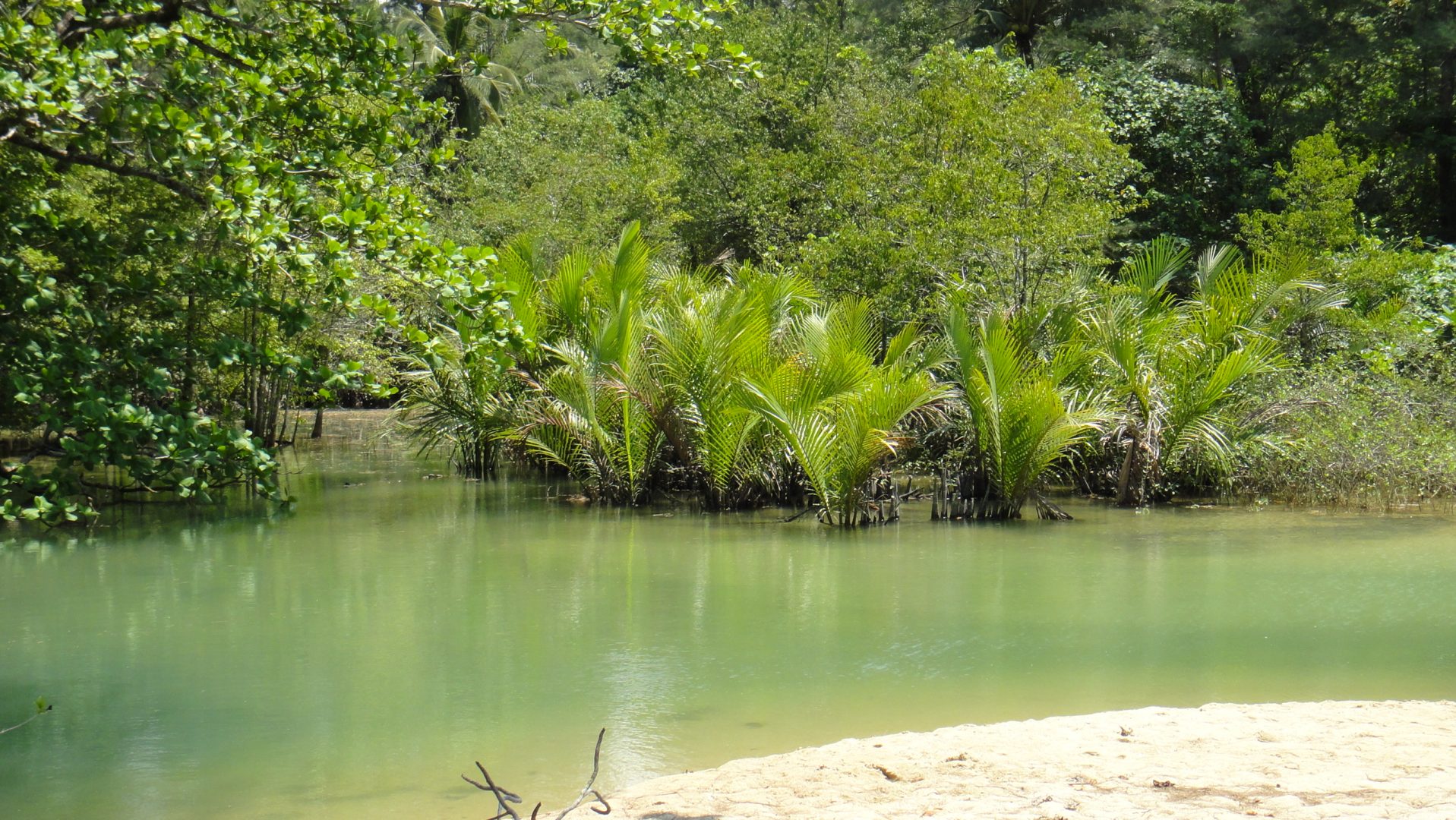À l’arrière de la plage, il y a des lagunes qui se vident dans la mer à marée descendante.