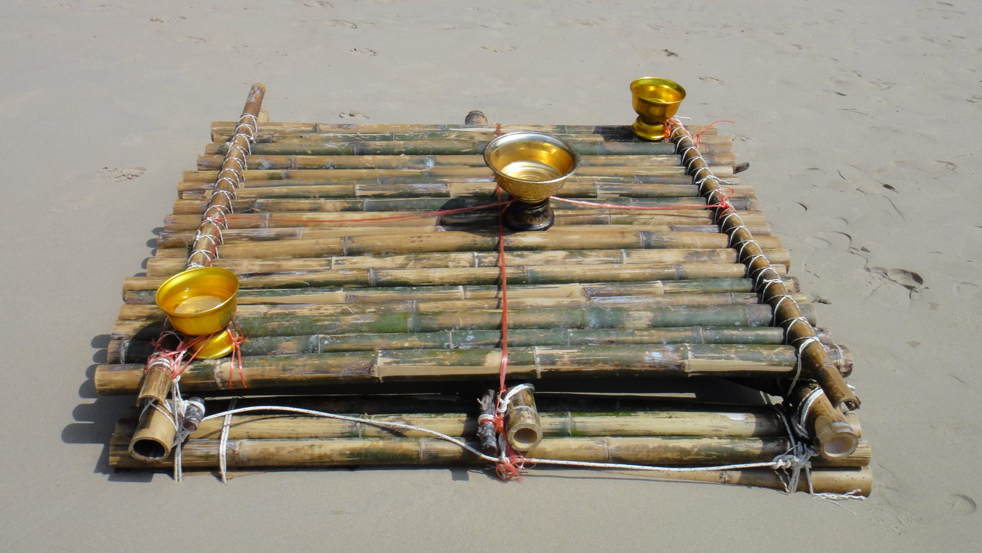 Un radeau trouvé sur la plage qui a sûrement été utilisé pour des offrandes lors d’une cérémonie.