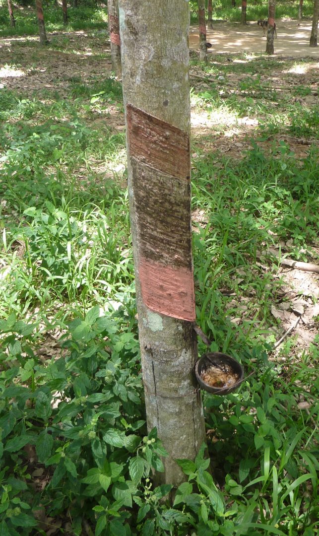 Collecte du latex en pratiquant des saignées dans l’écorce de l’hévéa pour produire du caoutchouc naturel.