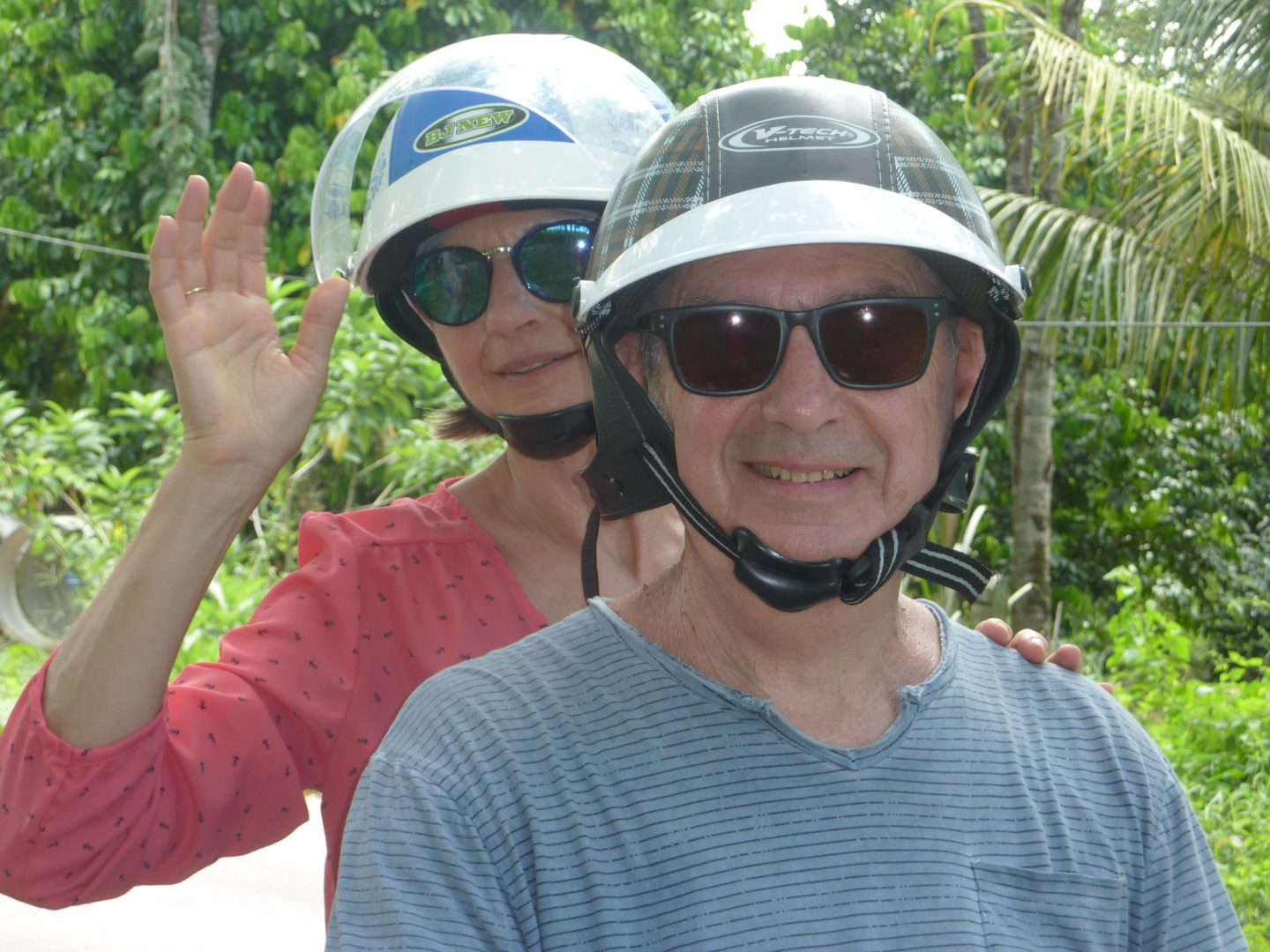 On part en scooter, il y a 8/10km depuis notre hôtel par une petite route agréable qui serpente entre les plantations d’hévéas et les plantations de palmiers à huile.