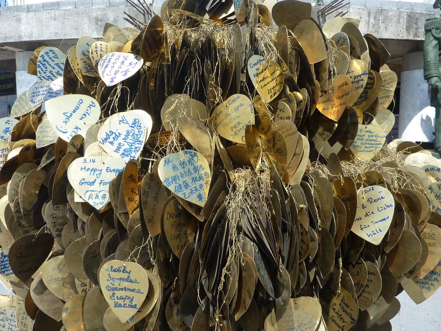 Dans toutes les langues, les visiteurs laissent une trace de leur passage en formulant des vœux sur des cœurs en métal jaune qu’ils accrochent sur le site à des arbres ou à d’autres supports.