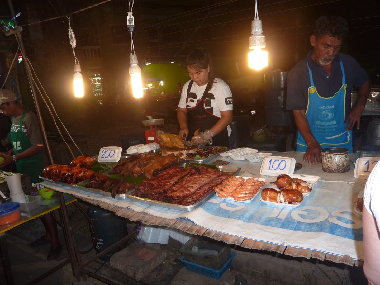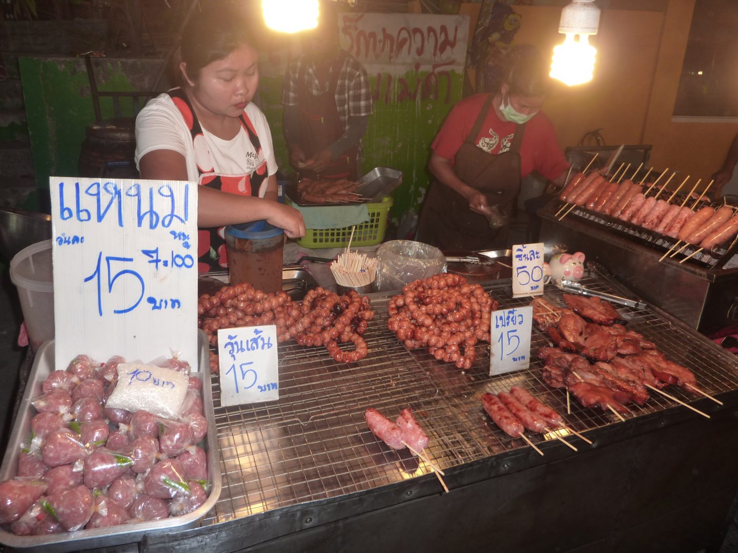 Il y a beaucoup de Night Markets en Thaïlande, principalement pour les touristes mais aussi pour les Thaïs. Le principe, c’est un grand emplacement avec plein de stands de nourriture et des tables + bancs ou chaises en plastique disponibles pour les consommateurs, parfois les tables sont dans un espace commun à tous les vendeurs mais aussi dans le stand d’un vendeur.