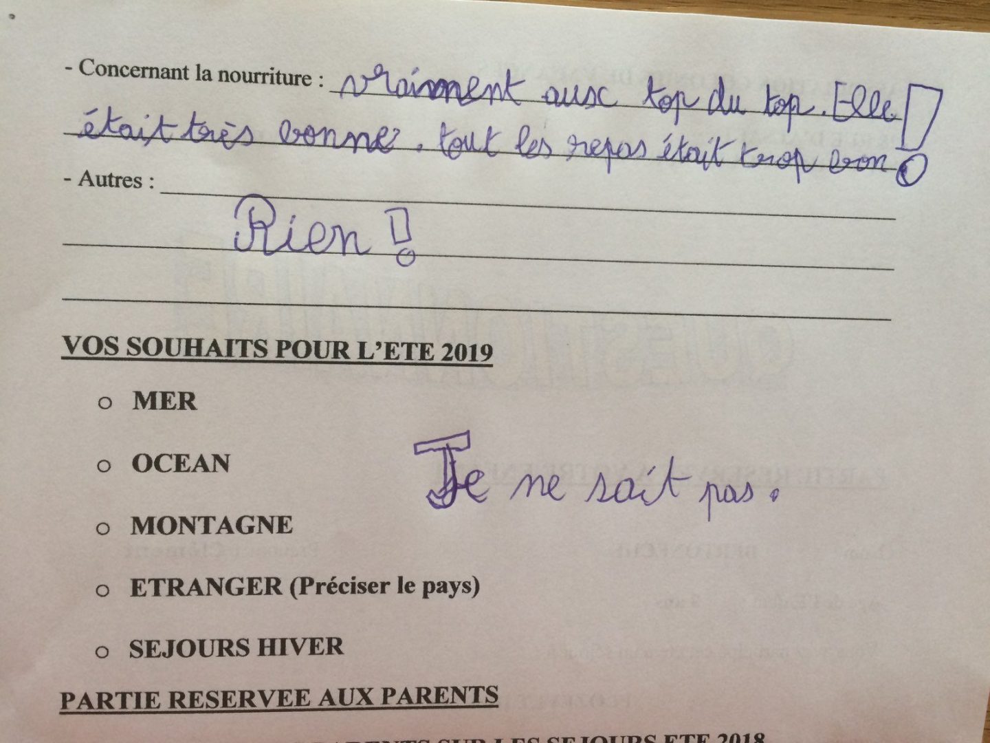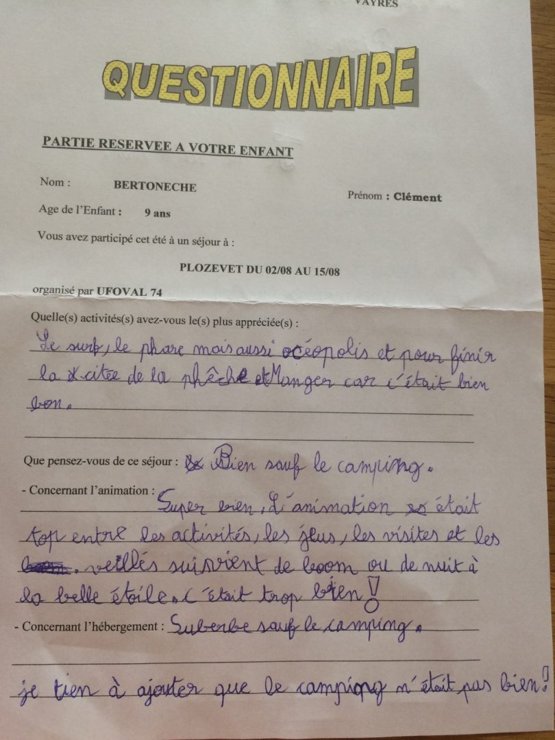 A la fin du séjour, il y a un questionnaire à remplir par les enfants, voici celui de Clément :