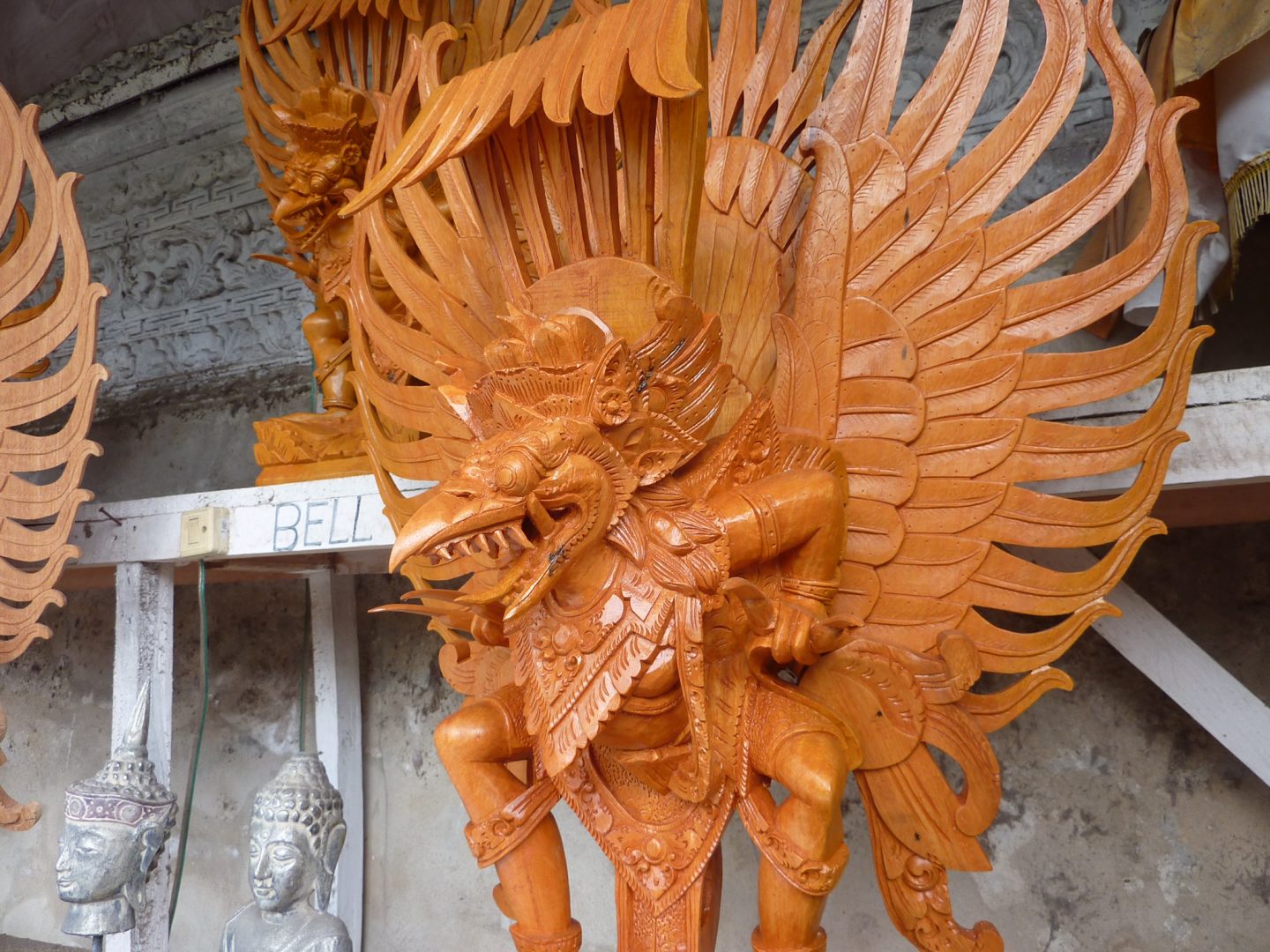 Lors d’une balade en scooter, on s’est arrêté dans un petit hameau d’une quinzaine d’habitations où il y avait des sculptures de Garuda exposées dans plusieurs petites boutiques. C’était plutôt des statues pour les Balinais que pour les touristes car peu de touristes passent par ce village. Ils décorent les temples dans leur maison avec cet oiseau mythique encore plus affreux que les gardiens du temple.