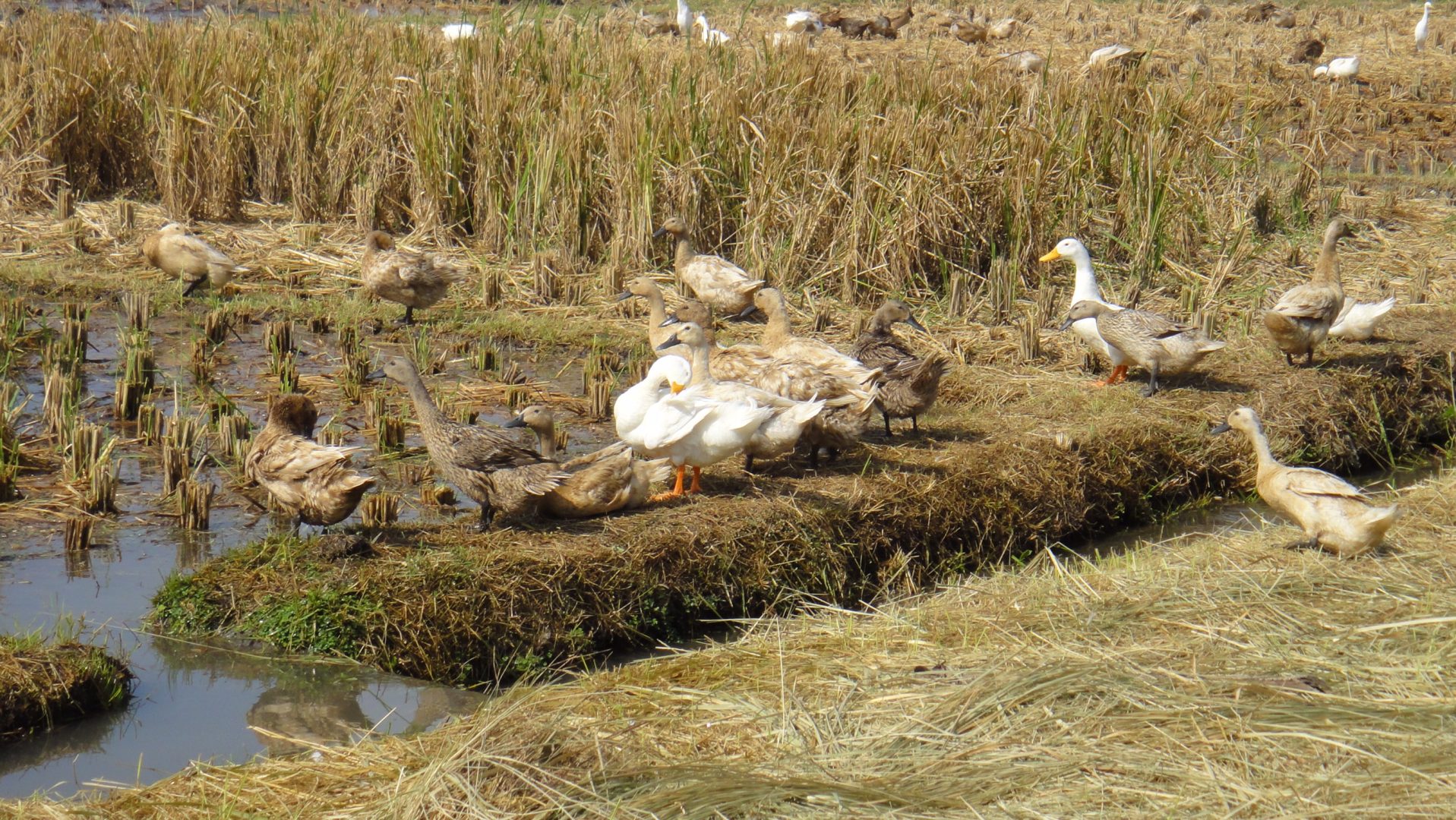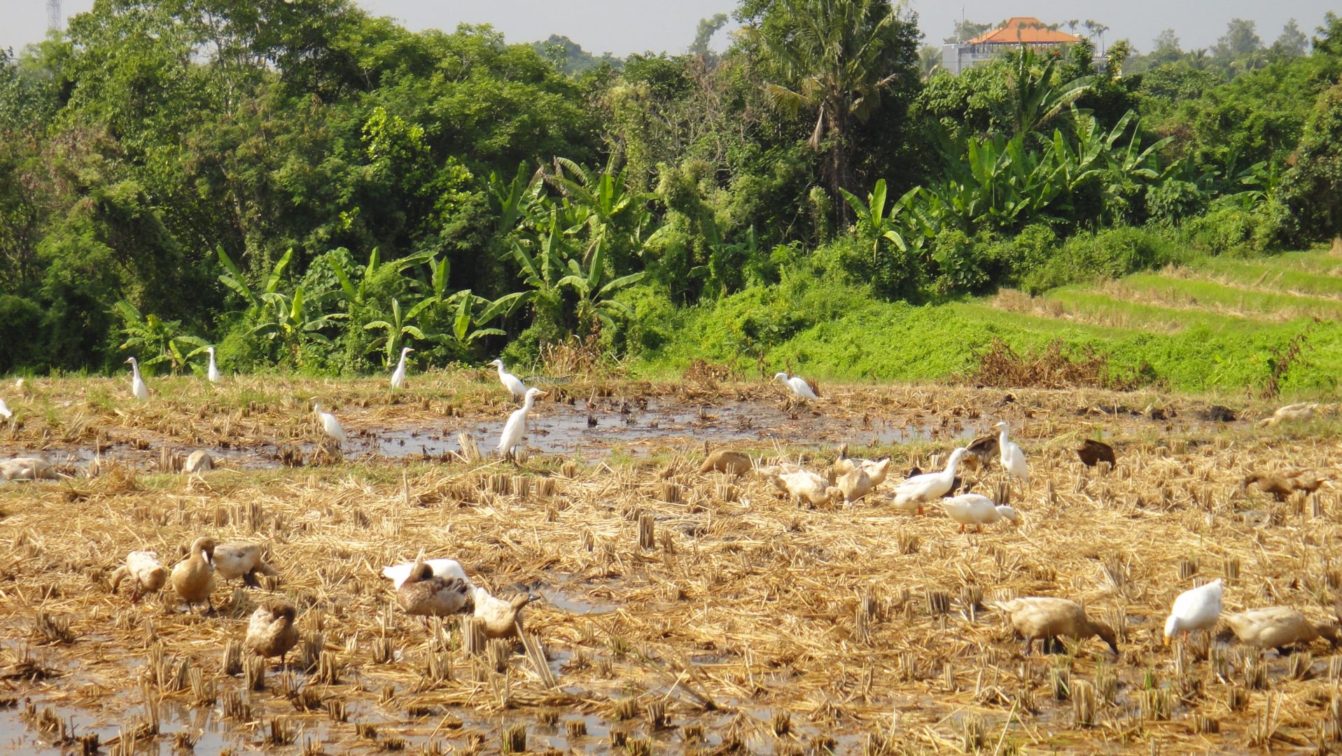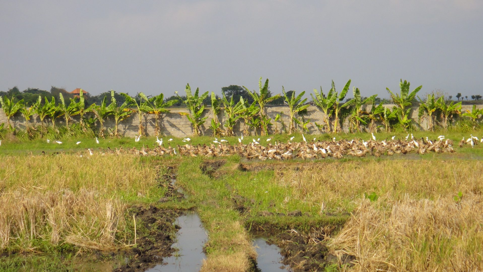 Les rizières sont assez différentes de celles d’Ubud, le climat est plus sec et plus chaud, la récolte est plus précoce. Les rizières sont donc en attente d’une nouvelle plantation, les canards sont au travail pour le nettoyage des parcelles ainsi que les laboureurs tout boueux.