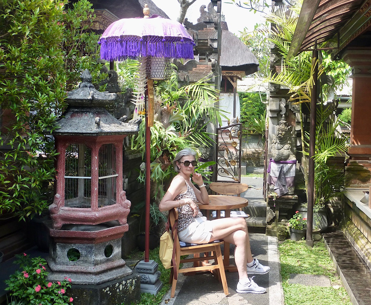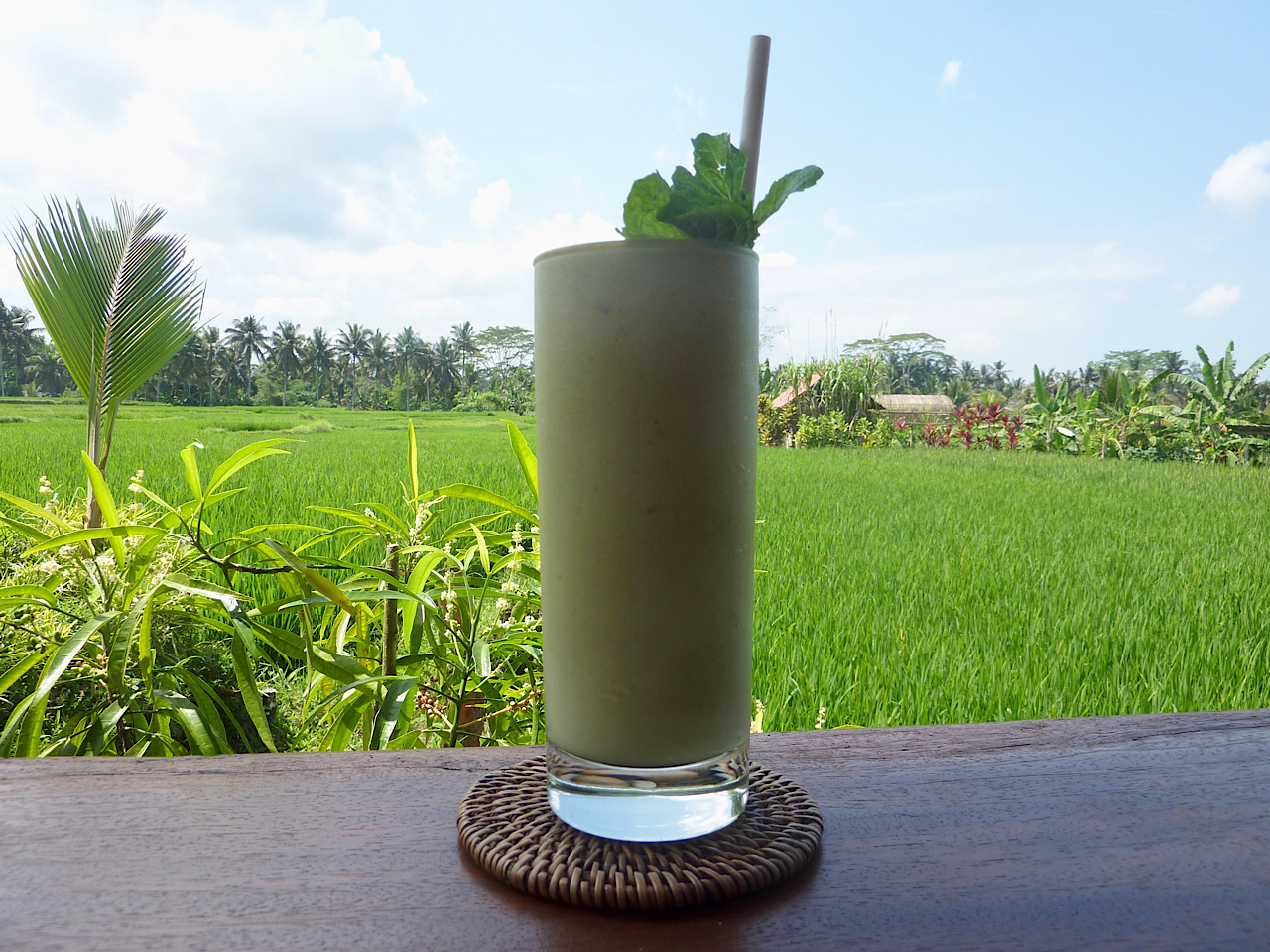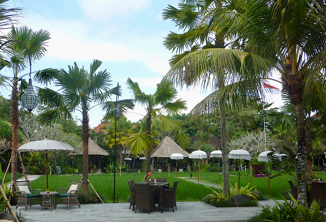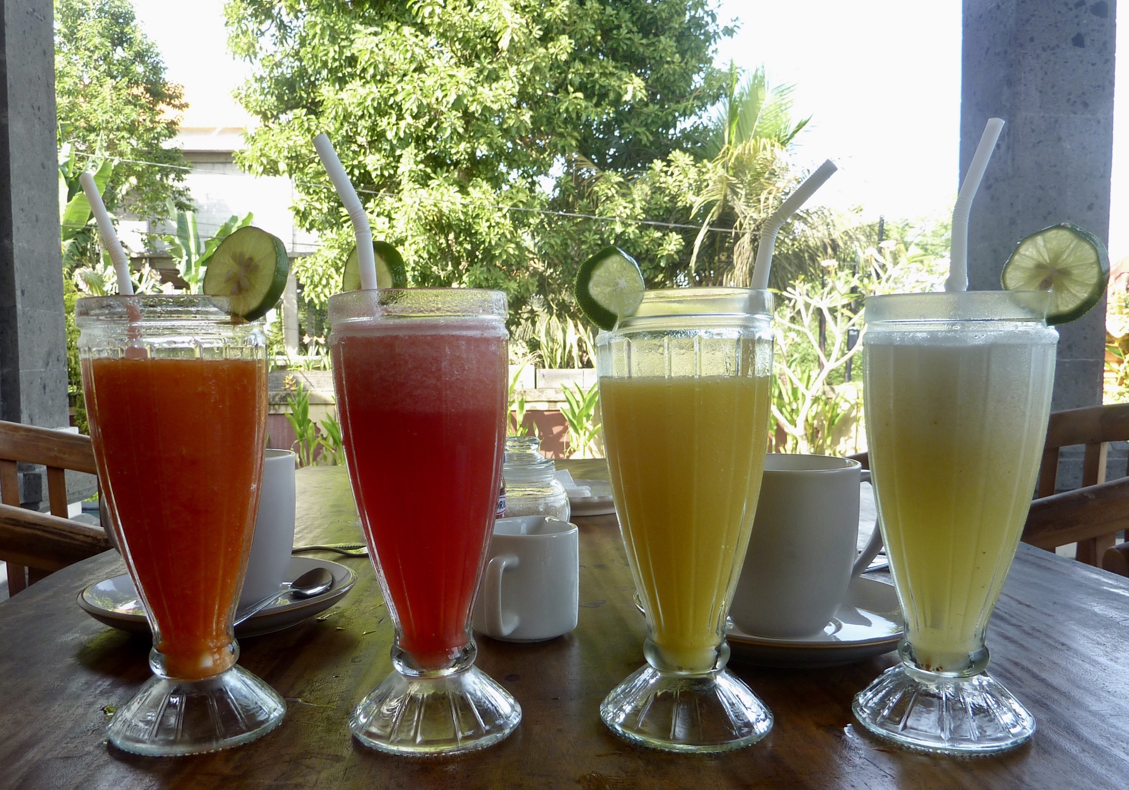Le matin, Putu et Desi surveillent notre arrivée sur la terrasse pour nous proposer le petit-déjeuner. Putu nous propose des jus de fruits : Ananas, Papaye, Mangue ou Pastèque. On lui explique (mal sûrement !) que l’on préfère un mélange (mixed) et vous avez le résultat sur la photo : 4 jus différents pour nous 2 👍. Elle était confuse, mais on a bien ri. Le lendemain tout est rentré dans l’ordre.