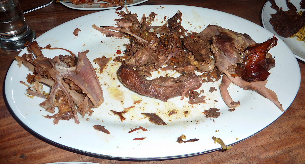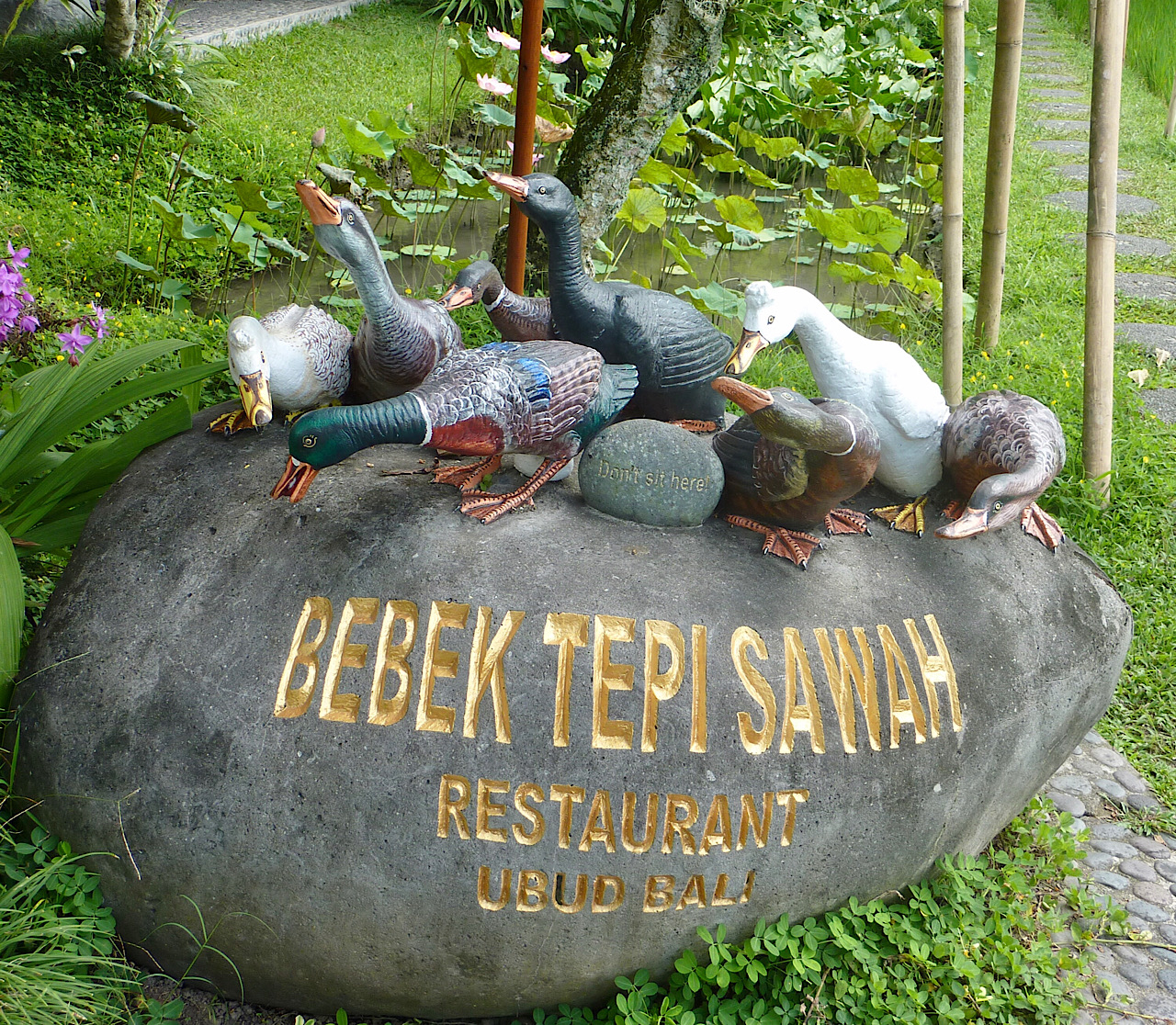 Un soir, c’est Wayan qui nous a proposé de faire le dîner. Du canard fumé (smoked duck ou bebek betutu) avec une panière de riz + un genre de petites brochettes au thon, des beignets de poisson et un plat de légumes d’ici avec de la noix de coco et une assiette de fruits. C’était délicieux avec des saveurs vraiment originales, un peu copieux peut-être 🤔, le canard entier pour 2 !