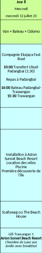 Journée avec réveil matinal, le départ de l’hôtel est prévu à 8h00, avec petit-déjeuner à 7h00. Le bateau est à 10h30 à Padangbai qui est à 1h30 de route environ si les conditions sont normales. Le programme initial a été modifié car la compagnie Ekajaya a annulé les bateaux de l’après-midi pour l’été.